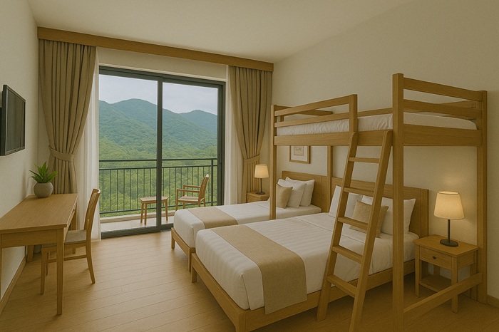 Nếu như phòng hướng biển mang lại sự lãng mạn, thì Family Room hướng núi lại đem đến cho du khách cảm giác bình yên, trong lành và gần gũi với thiên nhiên. Với diện tích rộng rãi, phù hợp cho nhóm 3–4 người, một Family Room hướng núi tốt sẽ giúp cả gia đình có những phút giây thư giãn trọn vẹn trong khung cảnh núi non hùng vĩ.